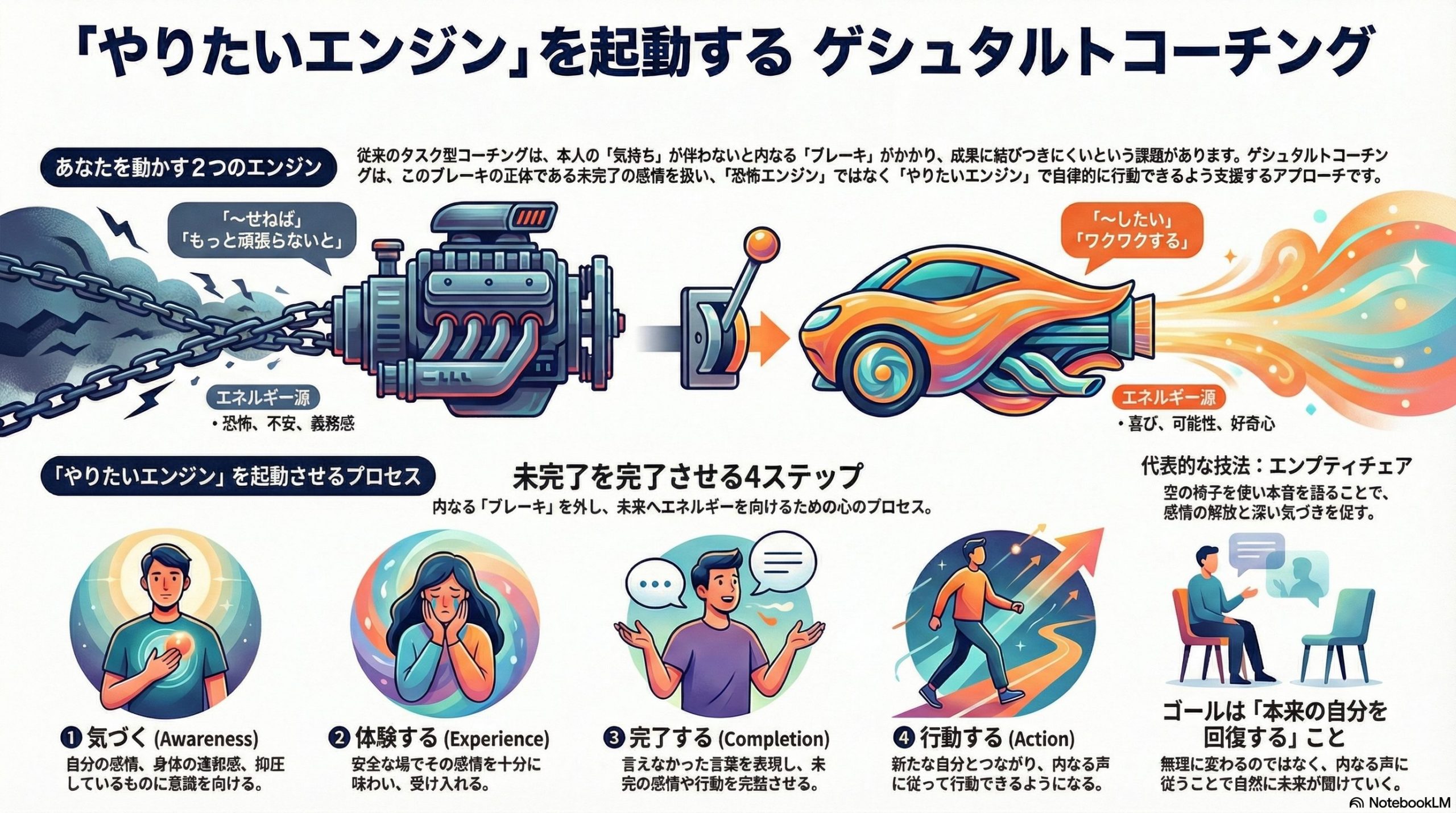 私のコーチングモデルは、未完了の出来事、感情を完了した後に、「~やらねばならない」「もっと頑張らなければならない」など「恐怖エンジン」を使って運転していたものを、「~したい」「未来を考えるとワクワクする」「未来の自分に会いたい」